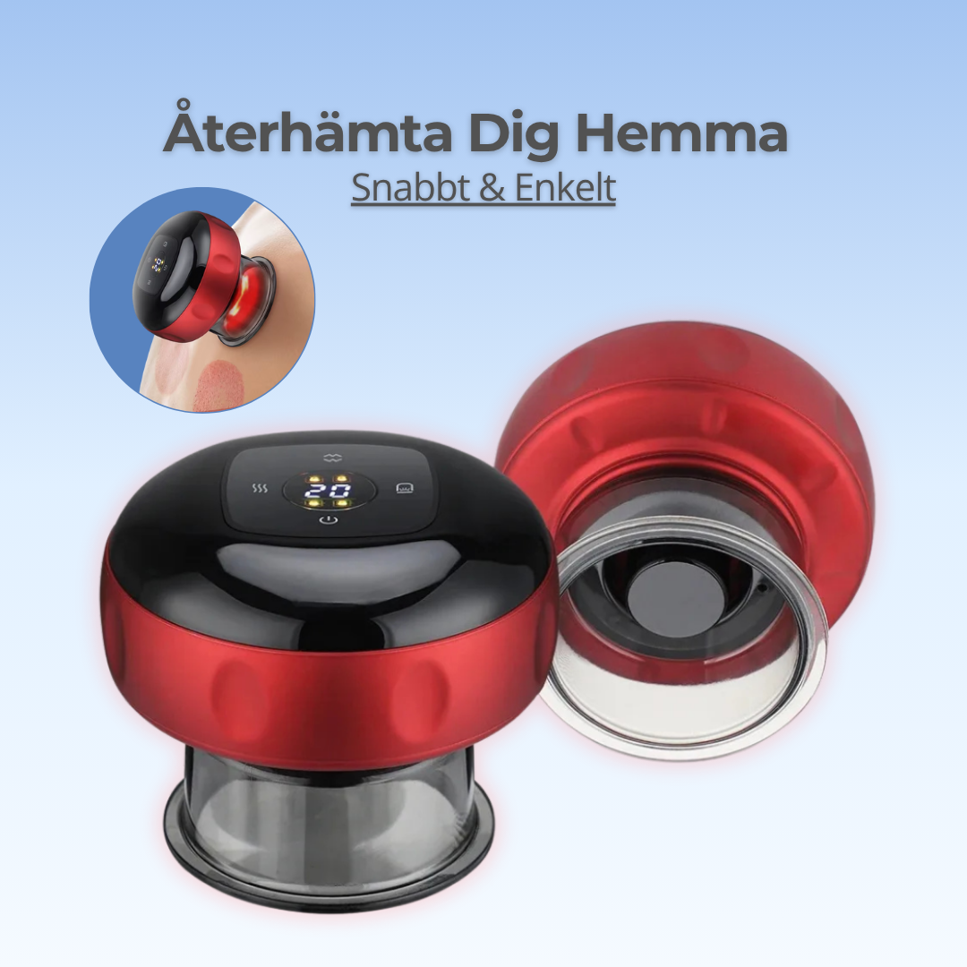 VakuKopp kombinerar vakuum, värme och rödljusterapi i ett smart verktyg som ger djup muskelavslappning och snabbare återhämtning – direkt hemifrån.