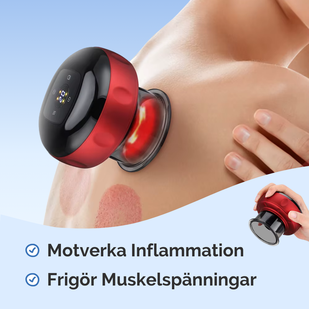 VakuKopp kombinerar vakuum, värme, vibration och rödljus för att frigöra muskelspänningar, öka blodcirkulationen och påskynda återhämtning direkt hemma.